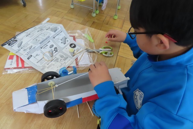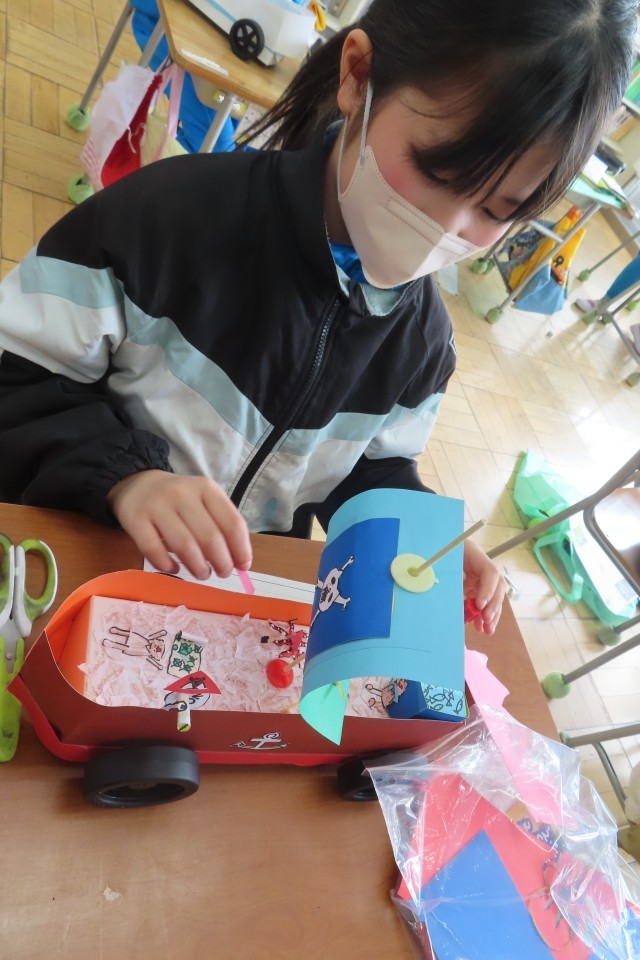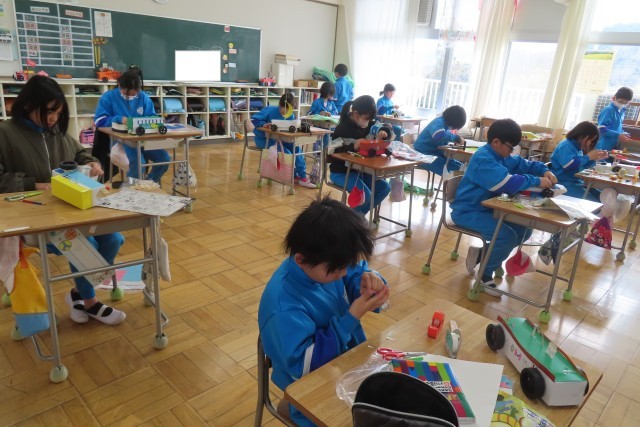 「ゴー!ゴー!ゆめの乗り物」ゴムや風の力で動く仕組みを備えた「ゆめの乗り物」が完成に近付いています。みんな真剣に考えて工夫してつくっており、作り方の紙をよく見ながらつくっている児童がいて嬉しく思いました。分からなければ誰かの力を必要とすることがあるけれど、自分でこうやって作り方をみながら取り組むことで、いろいろなものをつくることの楽しさも味わってもらいたいです。よく見ると「ゆめの乗り物」には細かな所まで工夫が加えられています。灰色がほしい部分に、新聞紙を活用した児童もいました。