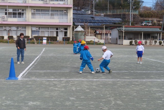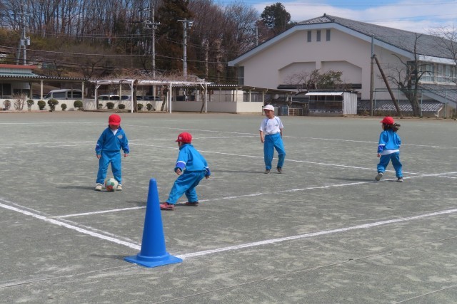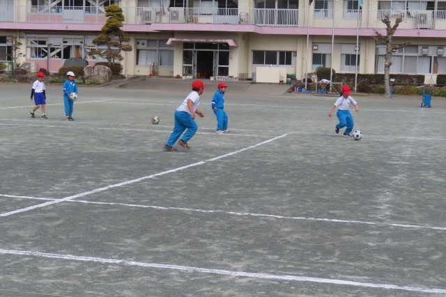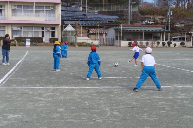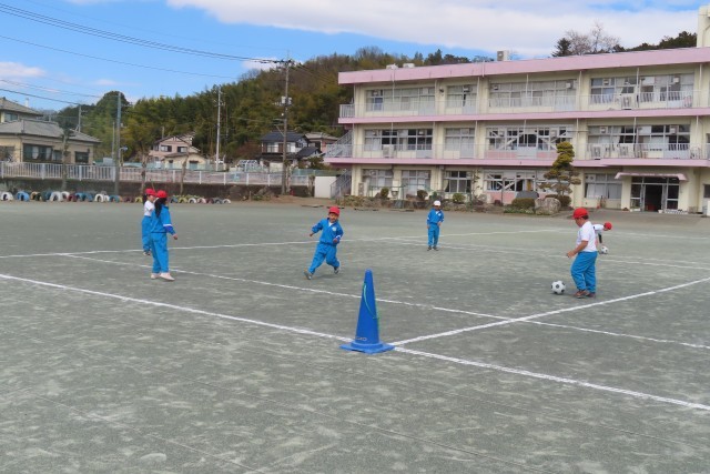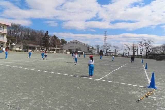 「ボールけり」風がなく、青空がきれいで春を感じるあたたかい天気だったので、半袖になる子がいました。今日は攻撃と守備に分かれてミニミニサッカーを楽しみました。サッカーボールを手で触ってはいけないことなどのルールをだんだんと実践しながら身に付けていきます。シュートを決めたり、シュートを阻止したりすると「笑顔いっぱい」大喜びです。こういう喜びを味わえるのが「ボールけり」の楽しさです。そのためにどうしたらいいか?低学年なりに一生けんめい考えることができるようになります。
