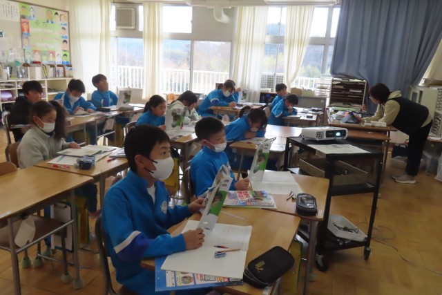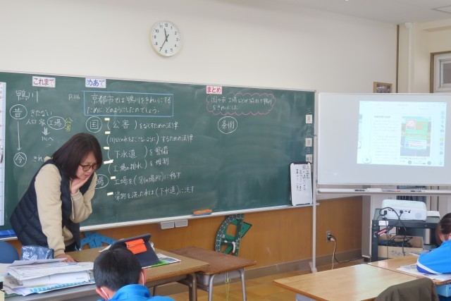 「環境を守るわたしたち」の学習では京都の鴨川を取り上げて学習しています。ちょうど教室では、きれいになった鴨川を守りたいという住民の願いを受けて定められた「京都府鴨川条例」のことを学習しているところでした。大切なのは、これを鴨川のこととして捉えるだけでなく、自分たちの身の周りの環境のこととつなげて考えることです。そして条例があるから、ではなくて自分の地域によく目を向け心を向けて、考えて、まずは身近な環境について考えて実践できる子になってもらいたいです。
