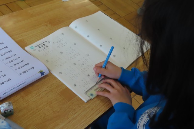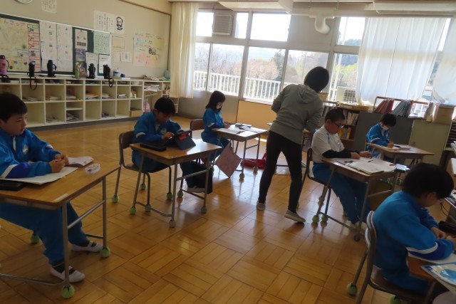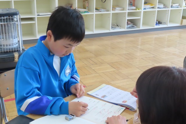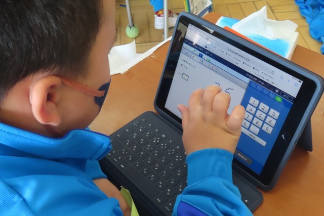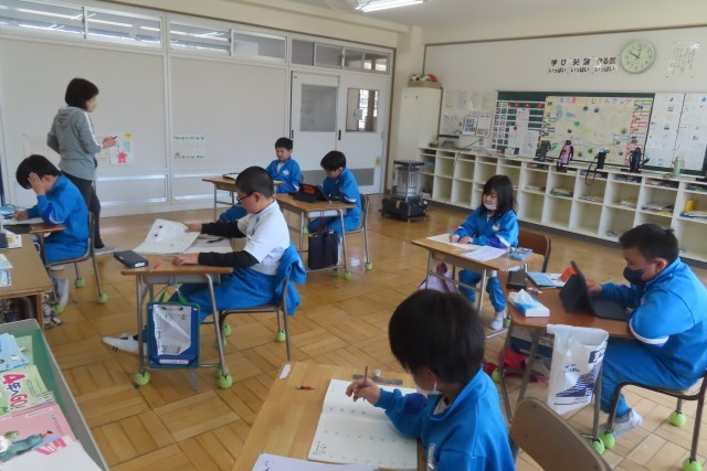 1年間の学習の総まとめとしてたくさんの課題があって、それを一つ一つクリアしています。先生から○をもらって次の課題へ。最後はタブレット上のドリルに挑戦です。1年間かけてためてきたポイントがあるようで、「あともう少しで目標クリアだ!」と真剣にタブレットに向かって頑張っている児童がいました。