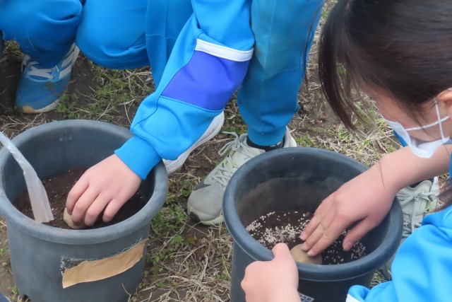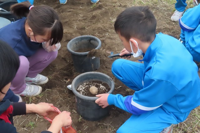 5年生はもうすでに6年生の学習の準備が始まりました。6年生になって植物のからだのつくりとはたらきについての学習において実験で使用するじゃがいもの栽培です。まずは畑に行って土を準備し、たねいもを植えて完了。土作りに思った以上に時間がかかっていたようでしたが、無事終了しました。もうすでに6年生の学習の準備が始まっているなんて、ワクワクしてきましたね。