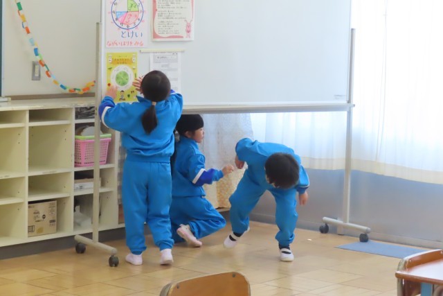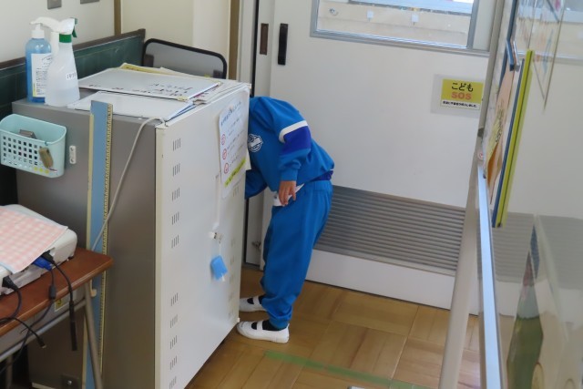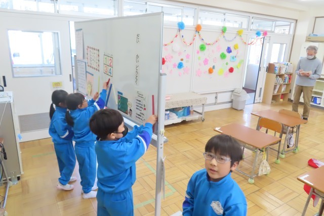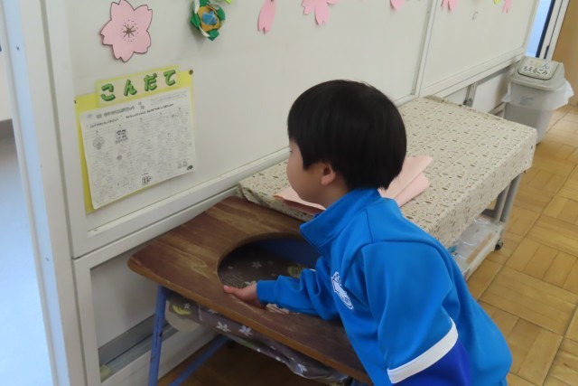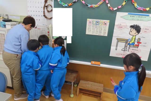 教室ではちょうど「きょうしつたんけん」の真っ最中でした。「これは?」「あれは?」初めて見る物、触る物がいっぱいです。一番興味津々なのは黒板用の磁石でした。「なににつかうのかな?」いっぱい謎が生まれましたが、だんだんとその謎が解けていきますね。
