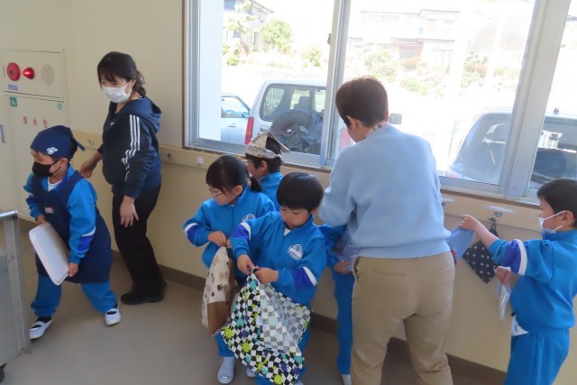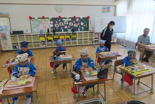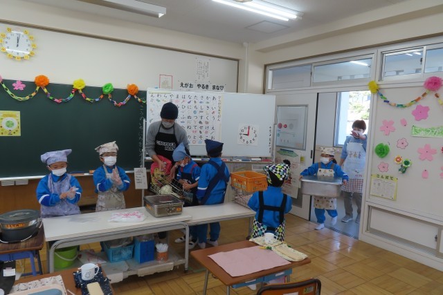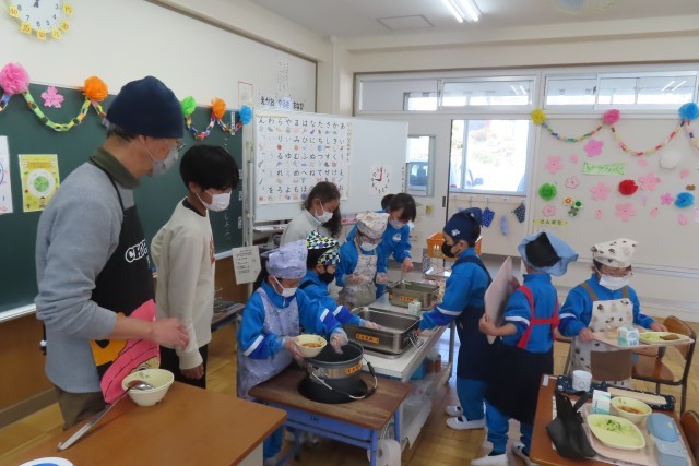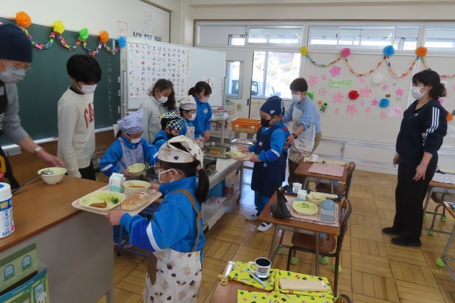エプロン・三角巾の身支度バッチリ、盛り付けや配膳も上手。6年生が手伝いにきてくれて安心して準備完了です。いろいろな作業がとても上手にできるので、先生がすごくたくさんほめていました。「おいしそう!」「おいしいな!」元気にモリモリ食べる1年生の姿を見て、大きな成長まちがいなし!確信しました。