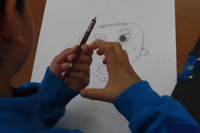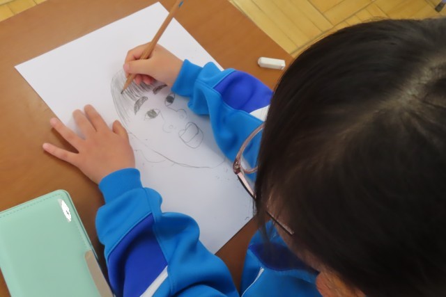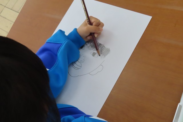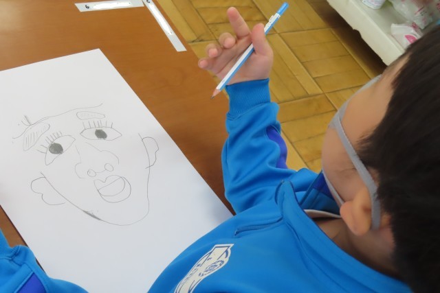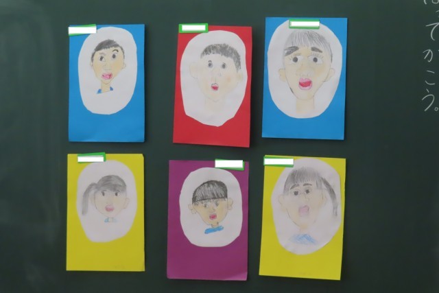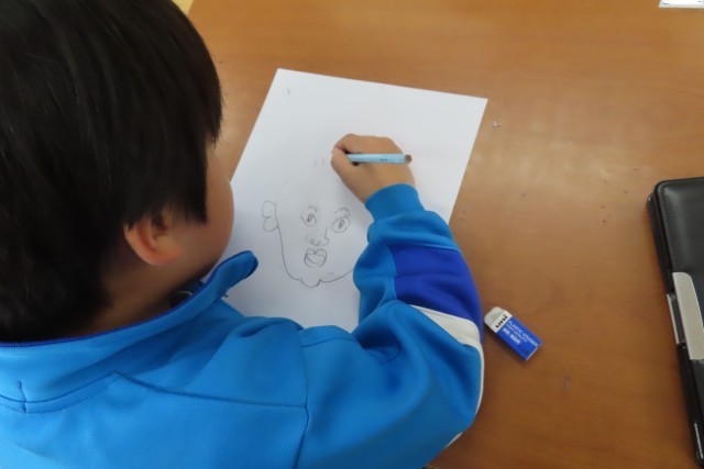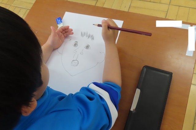 自分の顔をかきました。初めての図工は100点満点です!とっても上手なので、ほめました。すると・・・「だって、せんせいが きょうりょくしてくれるもん」と1年生が言います。昨日もそんな感謝の気持ちを言葉で表せる心の美しさに感動しましたが、今日も同じくです。そんな心のもち主の1年生が一生懸命に描く絵なので、日本一!世界一!上手です。