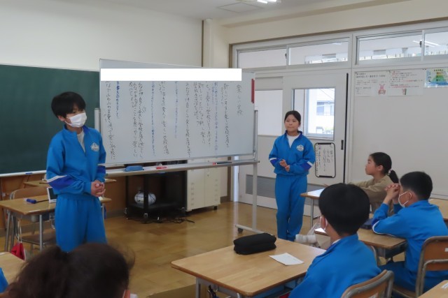 本校では児童会本部が中心となって毎月の生活目標を決めて呼びかけています。4月のテーマは「楽しい学校に」各教室で具体的な目標を話し合い、全校で一つにまとめます。今日は6年生が話合いをしていました。6年生は自分たちの学校を自分たちの手でつくり上げるために「やる気いっぱい」です。そして現在は6年生らしい話合いができるようにただ今学習中です。