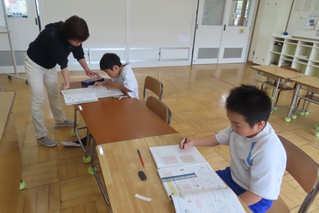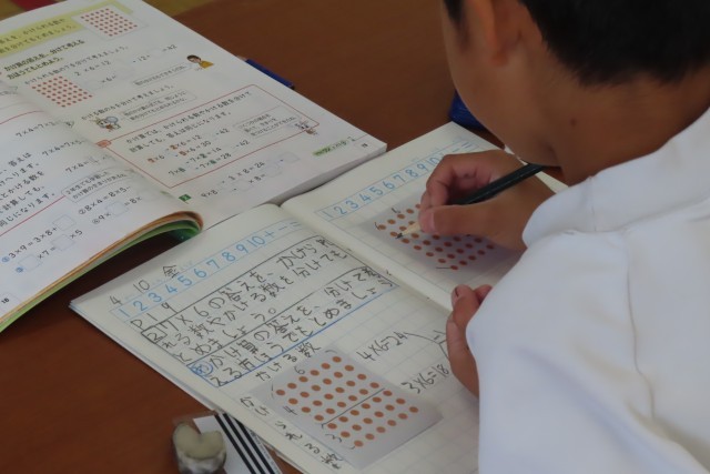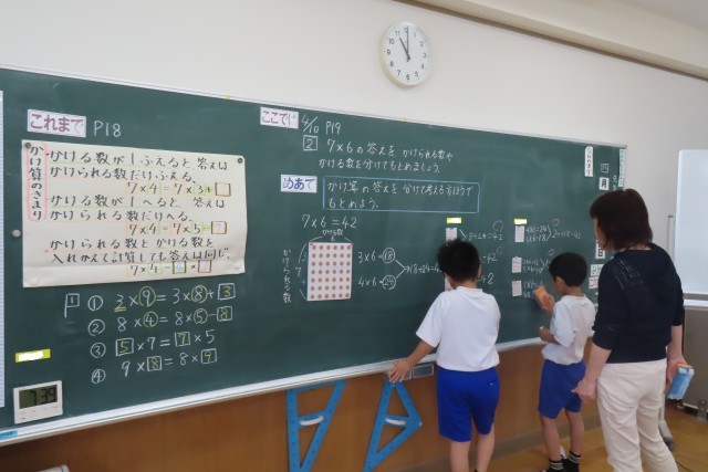 3年生の算数は「かけ算」の学習からスタート。「これまで」2年生のとき「かけ算 大すき!」な3年生なので、ワクワクする学習からの始まりに一生懸命がんばっていました。「ここでは」かけ算のきまりについての知識がさらに広がり深まります。なので、かける数が大きくなっても答えを求めることができるようにもなります。大好きなかけ算がさらに大好きになってお得意になるといいね!
