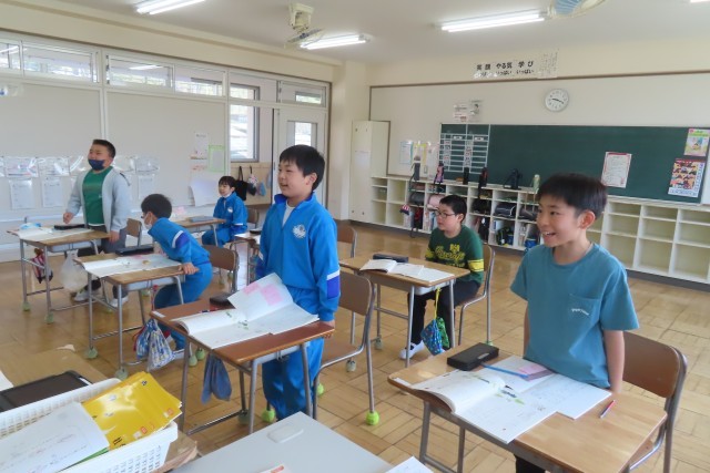 元気な「春のうた」の音読がきこえてきました。ちょうど教室では、(写真上)「ぜんぶ おぼえて 何も見ないで言えます!」挑戦中です。「ここでは」かえるの感じている春を思い浮かべながら気持ちを込めた詩の音読がとっても上手になりました。4年生らしい元気のいい春らしさの伝わる音読に児童も先生も「笑顔いっぱい」です。