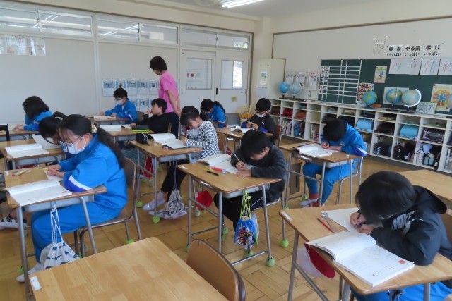 「かんがえるのって おもしろい」詩を楽しんでいます。「ここでは」言葉に着目して描かれていることを想像して読みます。その情景と自分自身をつなげて読むことができるようにもなっているので、詩を読んでみて、この言葉すてきだな。この表現好きだな。なんかよくわかる気がするな。いろいろな感想が生まれたようです。「このおかのうえ このきょうしつは みらいにむかって とんでいる」