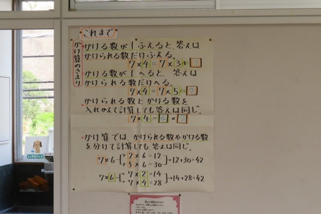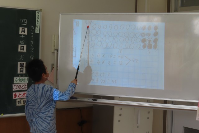「かけ算」の学習が大好きな3年生です。「これまで」2年生のとき「かけ算をがんばりました」「かけ算大すき」といっていました。「ここでは」かける数が大きくなってもバッチリ正解にたどり着くことができるようになります。今日は「4×13」の答えをどう求めるか?その求め方を一人一人考えることができました。図や表を使って考えたり九九の次を付け足して考えたり。友達の考えをよく聴いて自分の学習の参考になるようにしています。