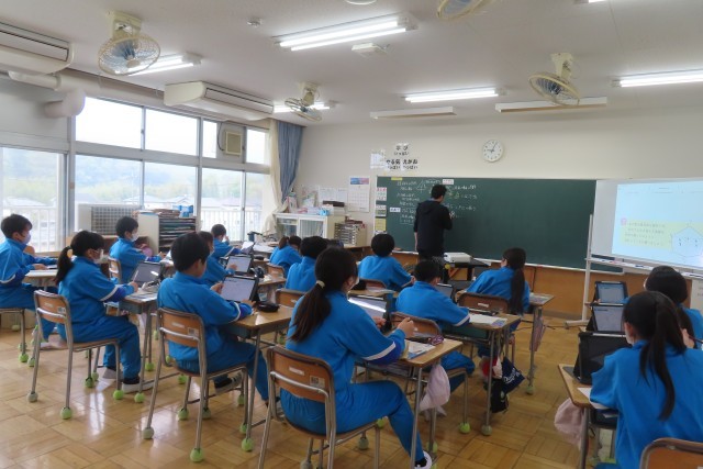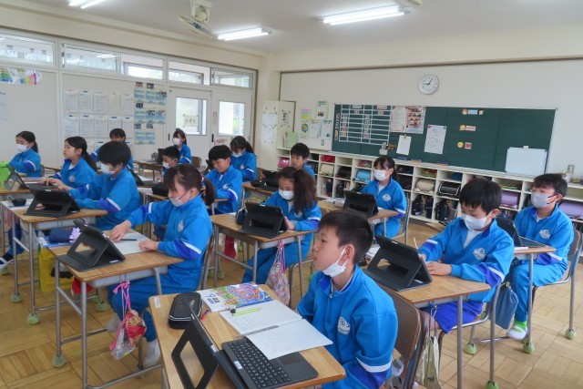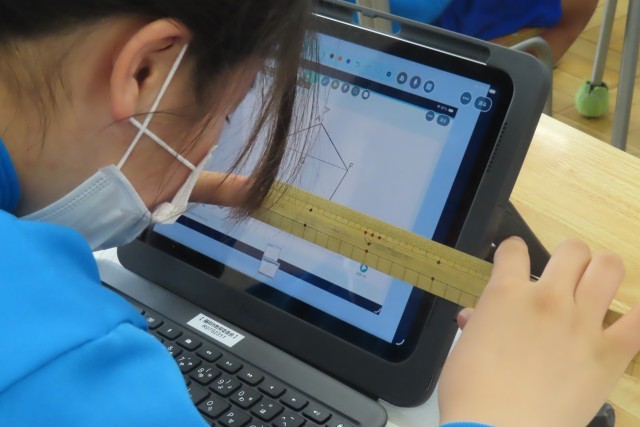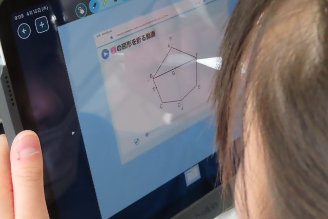 「対称な図形」の学習です。今日は線対称な図形の特徴を(昨日よりも)さらに調べてみます。今日のめあてに関する問いについて、答えの出た児童に「本当にそれでいいか?」さらに問い続ける先生。他にも自分で点を決め、線をかき、確かめてみます。ここで今日の学習が確実に自分のものになりました。