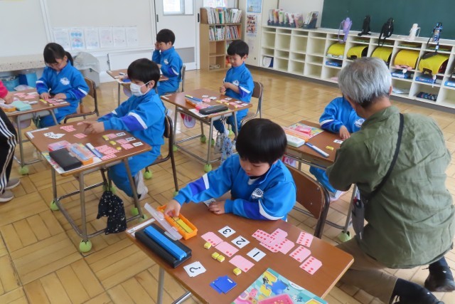 「10までのかず」に入りました。さんすうセットから必要なカードを取り出していました。「すうず」「すうかあど」名前を覚えました。そして今日は1~5までの数字について、「おはじき」、「すうず」、「すうかあど」を並べてみました。先生の予想以上にはやくできていました。しっかりと先生の話を聴いて動ける習慣が付いていることも素晴らしいです。こういう習慣が付いてくると、1時間の学習がさらに充実できますね。