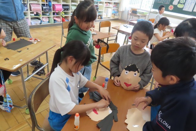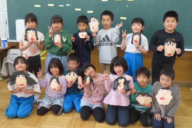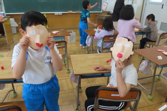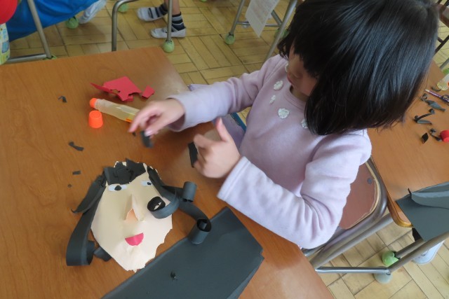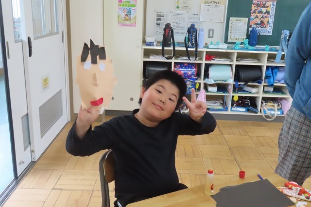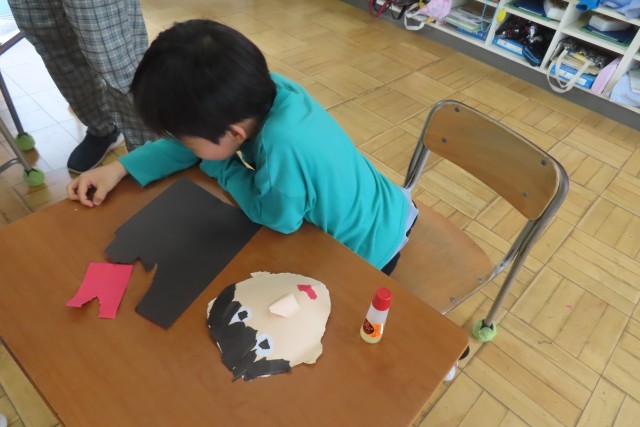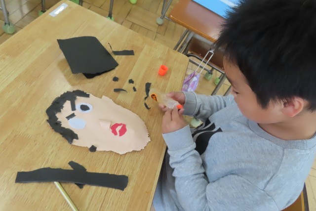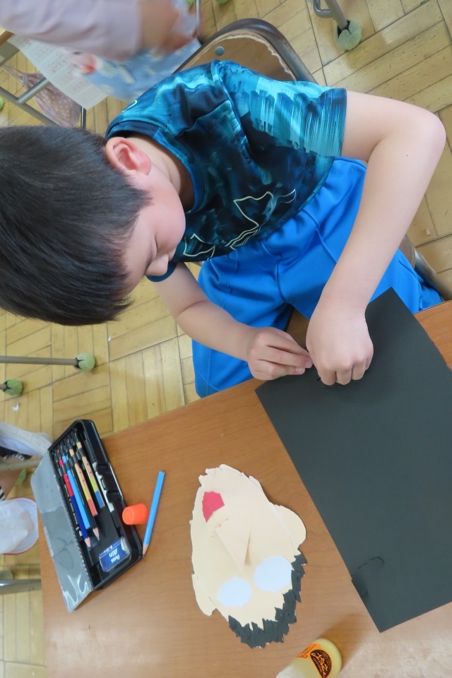 「笑顔いっぱい」な自分の顔が出来上がりました。はさみは一切使いません!全部自分の指先を上手に使って形をつくりました。色画用紙をちぎったりやぶいたりして表したい形に表現します。「しっぱいは せいこうのもと ってほんとだね!」と言う子がいて、いい学習ができたね!と思いました。さあ!とっても上手に、個性豊かな顔が出来上がりました!一人一人の表現力の高さに驚きました。