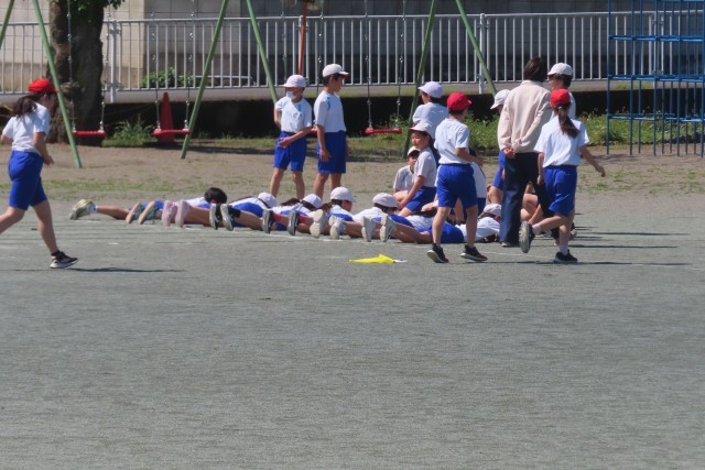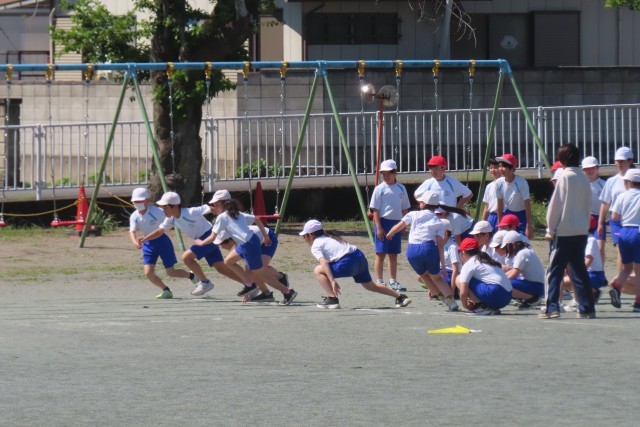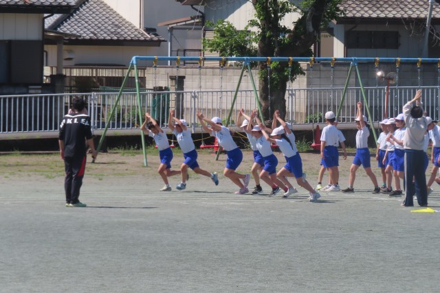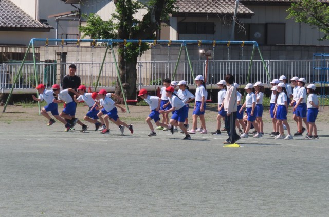 気持ちのいい青空に心地いい風。今日は外での体育には最高の気候です。陸上の学習に入りました。いろいろなウォーミングアップで「やる気いっぱい」のエネルギーをためて、50m走に挑戦していました。走り始めると、だんだんと「がんばれ!」「さいごまで!さいごまで!」声がきこえてきます。友達の声かけが自分の「やる気いっぱい」スイッチを入れてくれます。