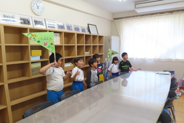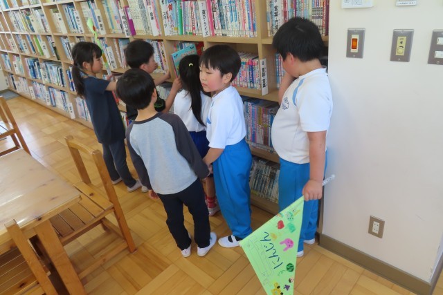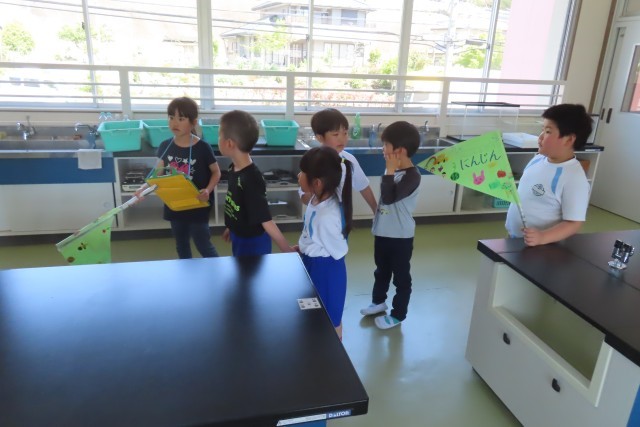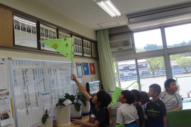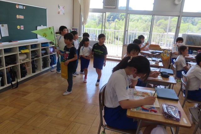 「にんじん」チームです。歴代の校長、PTA会長の写真なども上手に説明できました。そして上級生の教室にも静かに礼儀正しく入室し、上級生の学習の様子に「すごいなあ」。1年生も2年生も、いつも一緒に仲良く遊んでくれるお兄さんやお姉さんたちの知らない一面を見て、あこがれの気持ちをもったことでしょう。