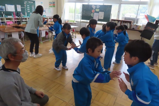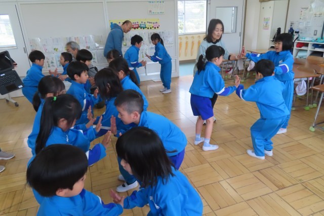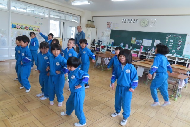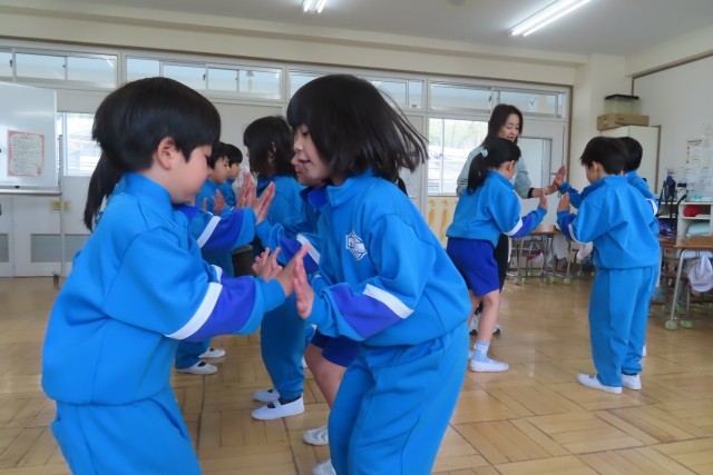 「セブン ステップス」英語で歌って楽します。ずっと「笑顔いっぱい」でした。なぜ笑顔いっぱいなのかというと?音楽にあわせて体を動かしているからです。先生から教えてもらう動き方だけでなく、自分たちで考えてみるとまた楽しくて!音楽が流れると自然に思い思いに体が動いてきます。こうやって「ここでは」リズムにあわせてお友達と仲良く一緒に音楽を楽しむことをたっぷり味わっています。