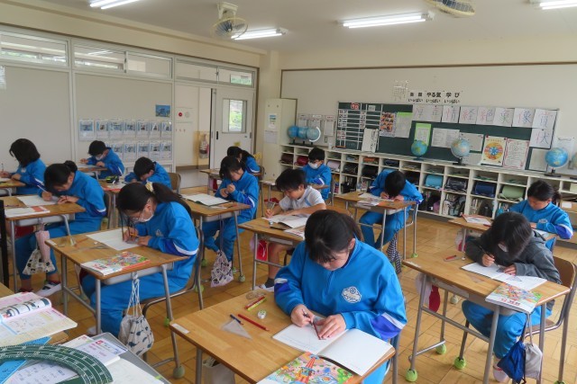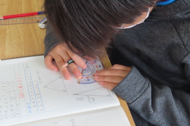 「図形の角の大きさ」の学習に入りました。「ここでは」いろいろな多角形の角の大きさについて、自分の力で考えることができるようになります。今日は「三角形の角の大きさの和のきまり」について自分でいろいろな三角形をかいてみて、角度をはかってみて、計算してみてその性質について考え出しました。いろいろな三角形をかいてみて同じことがいえるとなんだか、すっきり!なので今日学んだことはしっかり定着して、また次の学習に生かされることでしょう。