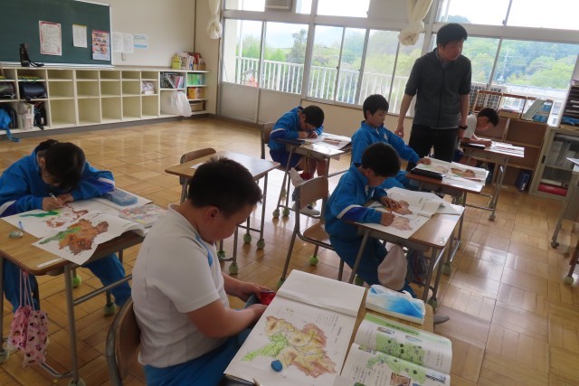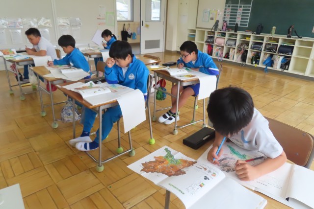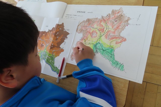 「これまで」3年生では藤岡市のことを学習してきました。4年生になったら群馬県のことを学習します。今日は群馬県の地形の様子を白地図を使って調べました。教室ではちょうど、山の名前を調べて白地図に書き込んでいるところでした。すると・・・「群馬県で一番高い山はどこだろう?」「おっ!白根っていう名前の山が2つあるよ!」一人の気付きや疑問がみんなのものになります。いっぱい学んで群馬県のことをもっと好きになってください!