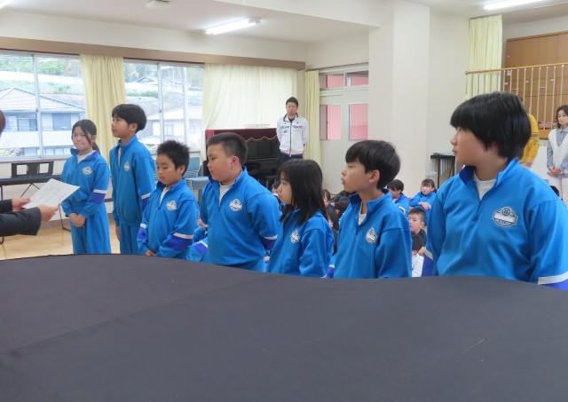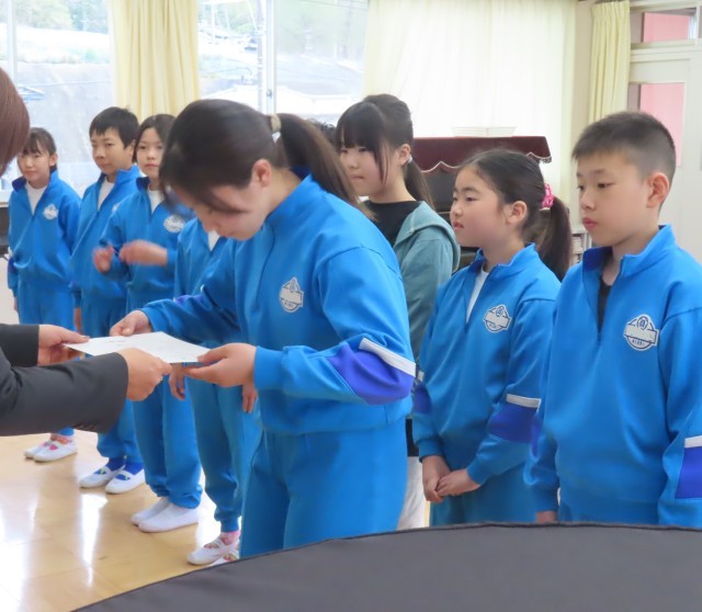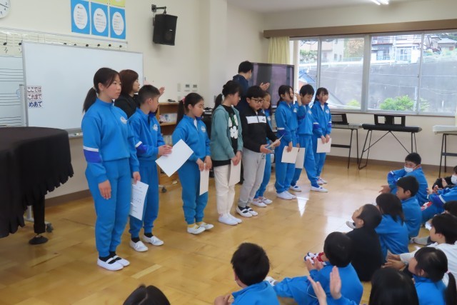 まずはじめに、剣道の大会において3・4年生の部で優勝した4年生児童、1・2年生の部で準優勝した1年生児童の表彰をしました。2人の名前が呼ばれると自然に拍手が湧き上がりました。中には「おめでとう」と声をかける児童もいて、みんなが2人の活躍に「笑顔いっぱい」になり温かい気持ちになりました。