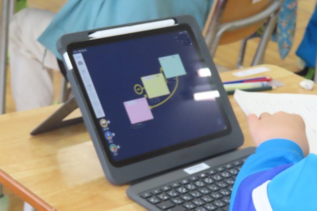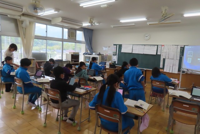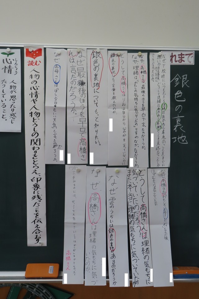 「銀色の裏地」の学習です。「ここでは」人物の心情や人物どうしの関わりを考えながら物語を読むことの意味を考えることができるようになります。今日はこの物語の3つの場面について主人公理緒の心情がどうゆれ動いているのか?読み取り表をタブレット上でまとめはじめたようです。そして黒板には最初にこの物語と出会ったときの感想が見られました。一人一人が「もっと深く読み進めていきたい!」と課題をもって「ここでは」の学習に向かいはじめたことがよく分かりました。