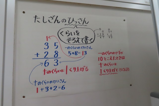 今日は「2けたのたし算」の筆算についてたっぷりと振り返り問題に挑戦していました。大切なこと「10のおひっこし」「くらいをそろえてかくこと」しっかりと定着しはじめています。さあどんどんおもしろくなってきたぞ!「このあとは」できるようになったたし算と同じように、ひき算でもできるかな?「やる気いっぱい」次から次へと広がり深まる算数の学習が大好きです。