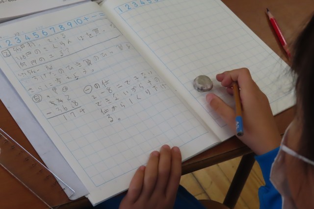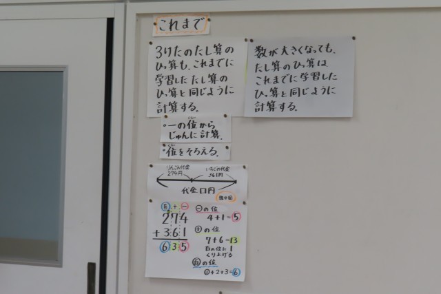 今日は3けたのひき算の筆算がバッチリできるようになりました。今日の問題は「542-368」です。その筆算のやり方について説明を自分の言葉でノートいっぱいに書いていました。そしてみんなで自分の考えを伝え合います。友達の考えを聴くときは自分の考えとしっかり比べて、おなじところは?にているところは?ちがう考えは?しっかり聴き取ってそこから学びを生みます。
