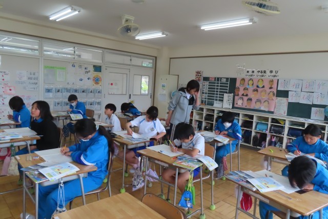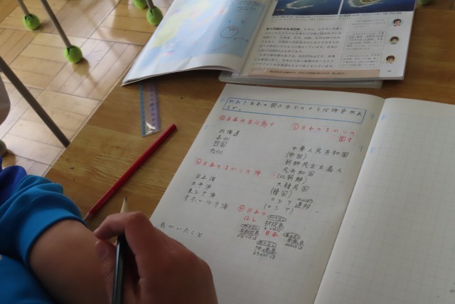 「世界の中の国土」今日は日本の国土について調べ学習です。「ここでは」国土を構成する島々、日本のまわりの国々や島、海、東西南北の端はどうなっているか?などの点から日本の国土の特色を考えます。日本国土を知り、その特色を生かした暮らしのことなど、だんだんと学習が広がっていきます。土地の様子と暮らしがつながっていることを詳しく学べる5年生の社会科も楽しみです。