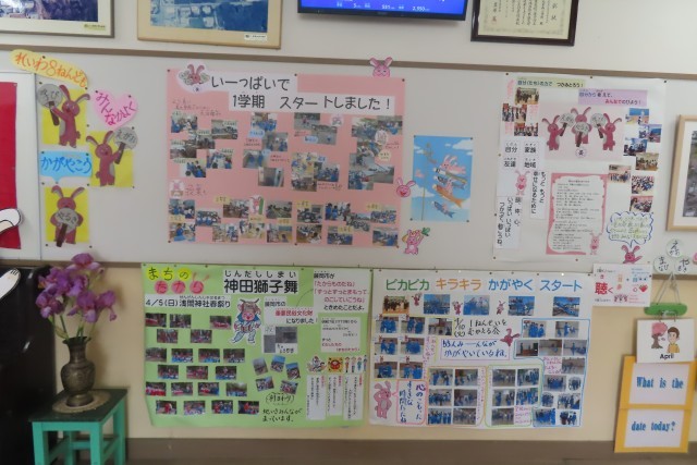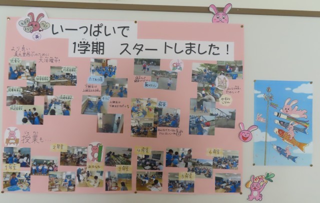 みんな大好き西うさぴょんが掲示板に新しい掲示物をつくってくれました。「学びいっぱい・笑顔いっぱい・やる気いっぱい で1学期をスタートしたね!」児童の頑張り、前向きなスタートを応援してくれています。みんな登校して玄関で嬉しそうに見ていました。