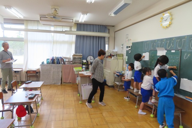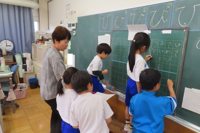 今日のひらがなは「ひ」です。「ひ」のつくことばを自分で見付けていったんワークシートに書き込んだら、それを黒板に書いてみます。チョークを持って書くのがうれしそうです。今日もいい言葉を見付けることができて、「もっともっとみつけたい!」あたりを見回していました。どんどん書いたり読んだりすることができるひらがなが増えて「学びいっぱい」の毎日です。