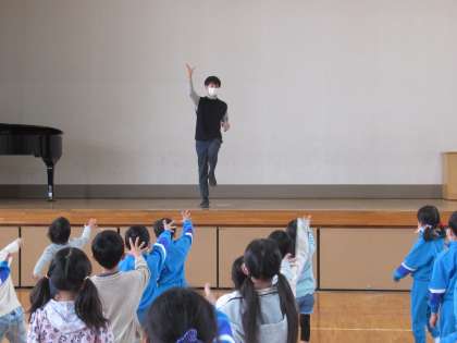 (写真上・中)はじめに子供たちにおなじみの「さんぽ」の歌に合わせて、ステージ上の先生とジャンケンをして楽しみました。1年生もリズムに合わせて上手にジャンケンができました。
