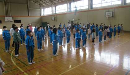 今日は業前活動の時間に、今年度初めての音楽集会を行いました。体育館で換気をして、大きく前ならえをして(間隔をとって)、感染症対策を講じて行いました。