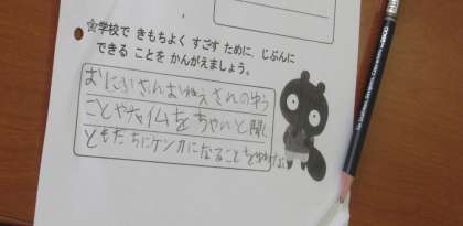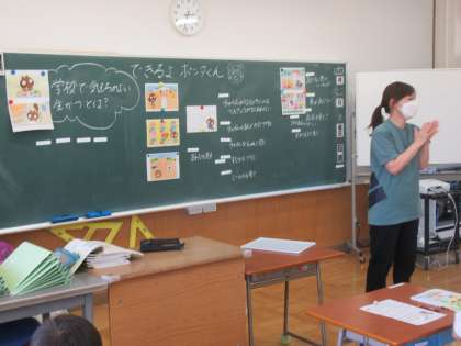 5校時、2年生の道徳では、読み物資料「できるよポンタくん」を読んで、「学校で気持ちよく生活するためには・・」について考えていました。子供たちからは、「チャイムを聞いて動く」「友だちとけんかになるようなことは言わない」など、たくさんの意見が出ました。友だちの意見に拍手をするなど、お互いのよさを認め合うあたたかい雰囲気で学習が進んでいました。また黒板には、子供たちの意見にたくさんのネームプレートが貼られていました。