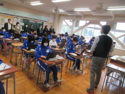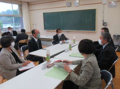 (写真上)会議の前に、東中の授業を参観しました。東中生が活発に発言し主体的に学習に取り組む様子が見られました。