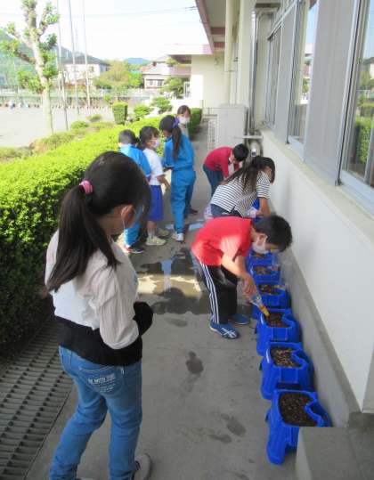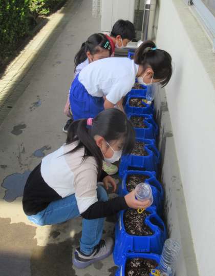 「校長先生、アサガオにお水あげます!」と、元気な1年生の声が聞こえてきました。1年生の登校後の最初の仕事は、生活科の時間にまいたアサガオの水やりのようです。「早く芽が出ないかなぁ」と、アサガオに声をかけながら水をあげていました。待ち遠しいですね。