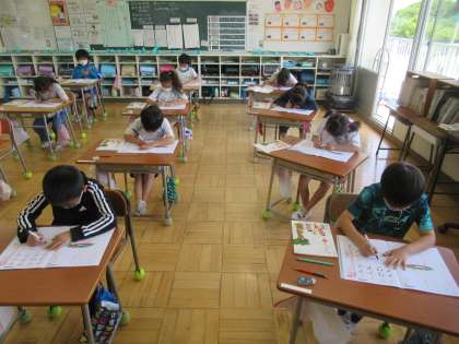 5月10日(火) 2年生の書写 公開日 2022/05/10 更新日 2022/05/10 できごと 5校時、2年生の書写では、カタカナの学習で、めあて「画(かく)の方向に気をつけて書こう」に取り組んでいました。子供たちは、先生の話をしっかり聞いて、ていねいに練習していました。
