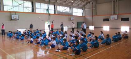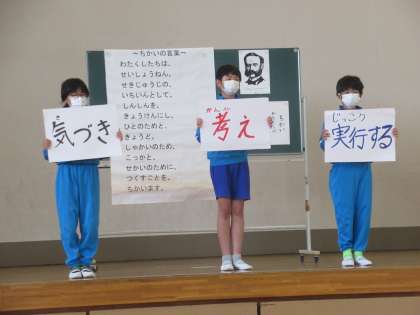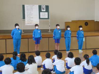 業前活動の時間に、「JRC登録式」を行いました。児童会役員よりJRCについての説明があり、「気づき・考え・実行する」という青少年赤十字の態度目標を学校生活の中で実践していきましょうと呼びかけがありました。最後に、全員で「誓いの言葉」を斉唱しました。児童会役員の子供たちは、原稿を見ずに(ノー原稿)自分の言葉で説明してくれたので、たいへんわかりやすかったです。また、説明を聞く子供たちも、話し手を見て、しっかり話が聞けて立派でした。こういう姿が、まさに「気づき・考え・実行する」子供たちの姿です。