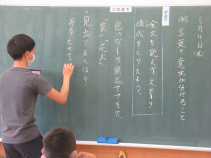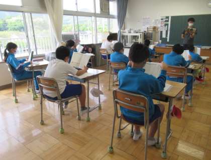 5月11日(水) 5年生の国語 公開日 2022/05/11 更新日 2022/05/11 できごと 1校時、5年生の国語では、今日から「見立てる」の学習単元に入りました。今日のめあては、「全文を読んで文章の構成をとらえよう」です。まずは、集中して全文の読み取りをしていました。
