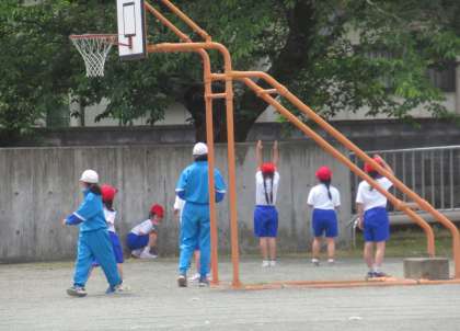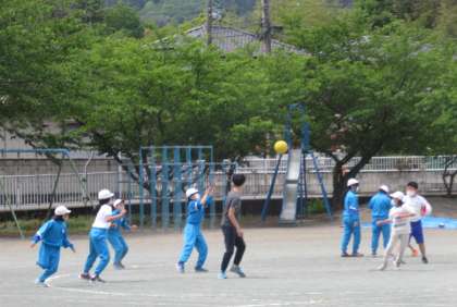 休み時間、子供たちはさわやかな青空の下、校庭で思い思いに体を動かしました。