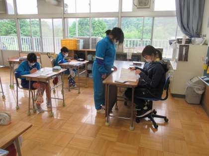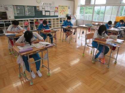 5校時、6年生の算数では、「分数と整数のかけ算・わり算」のまとめとして、教科書や計算ドリルの問題をたくさん解いていました。問題を解けば解くほど、学習内容が定着することでしょう。