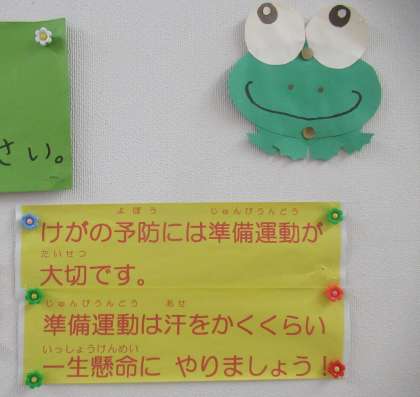 保健室前には、時期に応じて、子供たちに健康安全を呼びかける掲示物が貼ってあります。子供たちが興味をもって見られるように、養護教諭手作りのかわいらしく楽しい掲示物です。