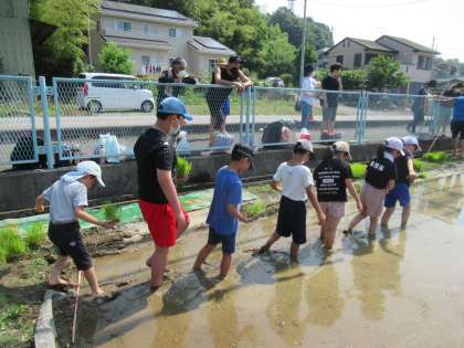 (写真下)「稲穂の会」の会長さんが丁寧に苗の植え方を教えてくれました。子供たちは2本ずつ苗を取って植えました。