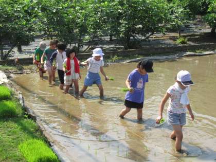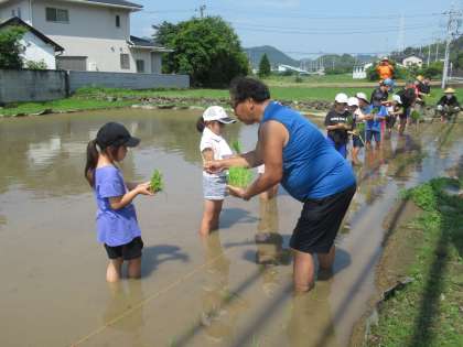 本日9時より、「稲穂の会」(美九里西小PTA役員OBによる地域ボランティア団体)主催の田植え体験が行われました。美九里西小と美九里東小の児童、保護者、総勢36名が参加しました。久しぶりに朝からよいお天気となり、時折吹く心地よい風を感じながら、みんなで田植えを楽しみました。
