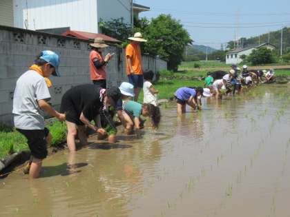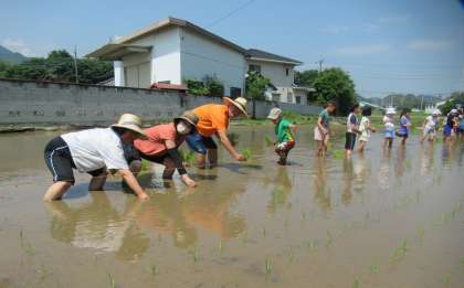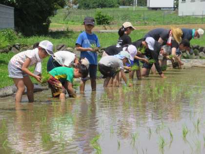 (写真下)職員も子供たちと一緒に田植えを楽しみました。保護者が写真を撮ってくださいました。