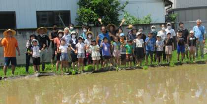 (写真上)田植えを終えて、みんなで記念写真を撮りました。おいしいお米ができますように!