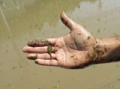 (写真中)子供たちが、田んぼにいた「カブトエビ」を発見しました。