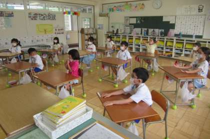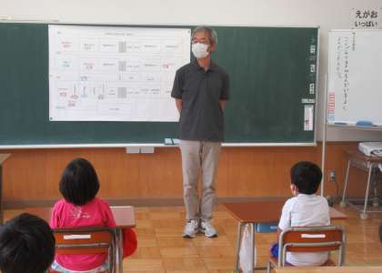 (写真上)今日から、新しく特別支援教育支援員としてお世話になる先生の勤務がスタートしました。早速、1年生の教室で、子供たちと対面しました。どうぞよろしくお願いします。