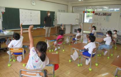 (写真中・下)先生からの自己紹介が終わった後、子供たちからの質問タイムになりました。「好きな食べ物は何ですか?」「好きな動物は何ですか?」「好きな色は?」等々、質問が止まりません。先生の答えにも拍手喝采で、とにかく新しい先生に興味津々の子供たちでした。