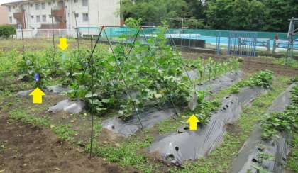 (写真下)2年生の学級園に行ってみると、これから実る野菜を守るために、「鳥除け」のグッズ(黄色の矢印)が四方に張りめぐらされていました。