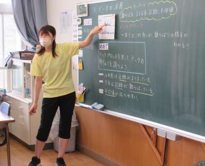 1校時、6年生の算数では、「データの活用」の学習で、めあて「ドットプロットを使ってデータの特ちょうを調べよう」に取り組んでいました。まず、自分で考えて、友だちと考えを共有します。黒板にはネームプレートともに、子供たちの考えが書かれていきます。