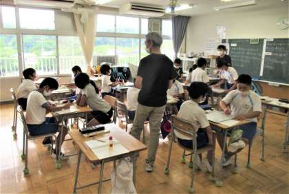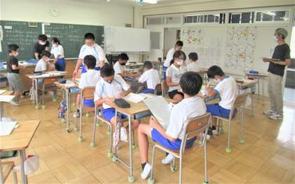 6月21日(火) 5年生の算数 公開日 2022/06/21 更新日 2022/06/21 できごと 3校時、5年生の算数では、めあて「商が割りきれないときの答え方を考えよう」の学習に取り組んでいました。これまで4年生の時に学習したことをふり返りながら、2人1組になって、今日のめあてに向けて学び合いをしていました。 担任に加えて支援員の先生も一緒に、子供たちの学習をサポートしています。