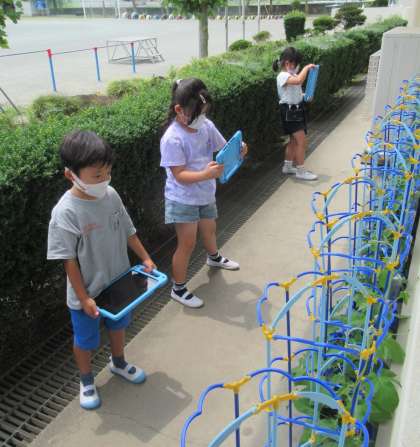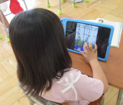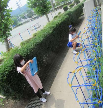 6月21日(火) 1年生の生活科(2) 公開日 2022/06/21 更新日 2022/06/21 できごと (写真上・中)タブレットPCで自分のアサガオの様子を撮影しました。 (写真下)席に戻り、タブレットPCに記録した写真を拡大して、じっくり観察していきます。